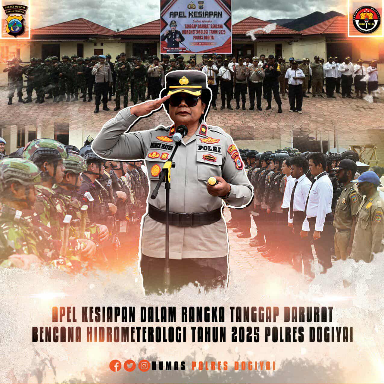 Apel dipimpin langsung oleh Kapolres Dogiyai Kompol Y. Mince Mayor, S.H., dan diikuti oleh para pejabat utama Polres Dogiyai, personel TNI, Brimob, Sat Samapta, Sat Reskrim, Intel, serta unsur Satpol PP Kabupaten Dogiyai. Kehadiran Satpol PP dalam kegiatan ini menjadi wujud sinergitas antara Polri dan Pemerintah Daerah dalam menghadapi potensi bencana hidrometeorologi di wilayah Dogiyai.