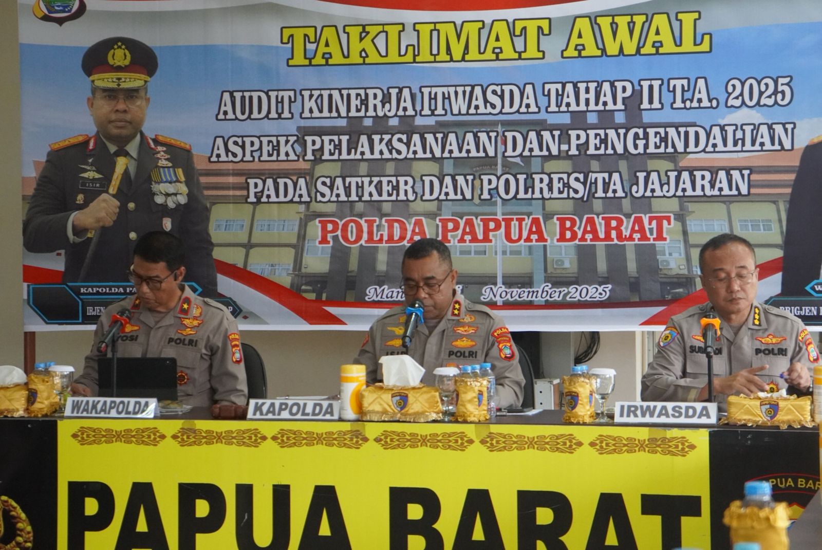 Jerat Fakta | Manokwari– Kapolda Papua Barat memimpin langsung pelaksanaan Taklimat Awal Tahap II Audit Kinerja Itwasda Polda Papua Barat T.A 2025, yang berlangsung di Ruang Vicon Lantai 2 Mapolda Papua Barat, Kamis (6/11/2025) pukul.